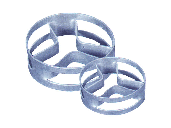 特点:减少了填料层内的翻边及内弯叶片的端点所形成的汇聚分散点小的高径比,在乱石堆时使填料成一定程度的有序排列,改善了填料层的流体结构,降低了填料层的轴向返混,降低了床层的阻力降,处理能力大,夹带小,不易结垢的优点。