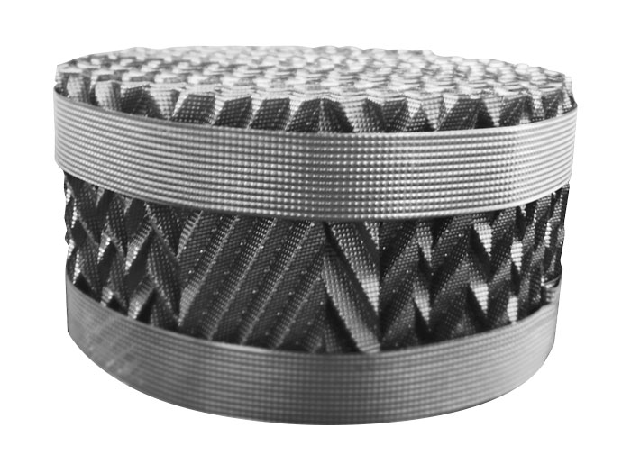特点:压延棘孔板波纹填料是在金属薄板上碾压出高分布密度的带棘微细小孔,而后轧制波纹片,最后组装成盘。由于金属表面有密集的微小棘孔,增强了填料的湿润性能,利于填料的传质。