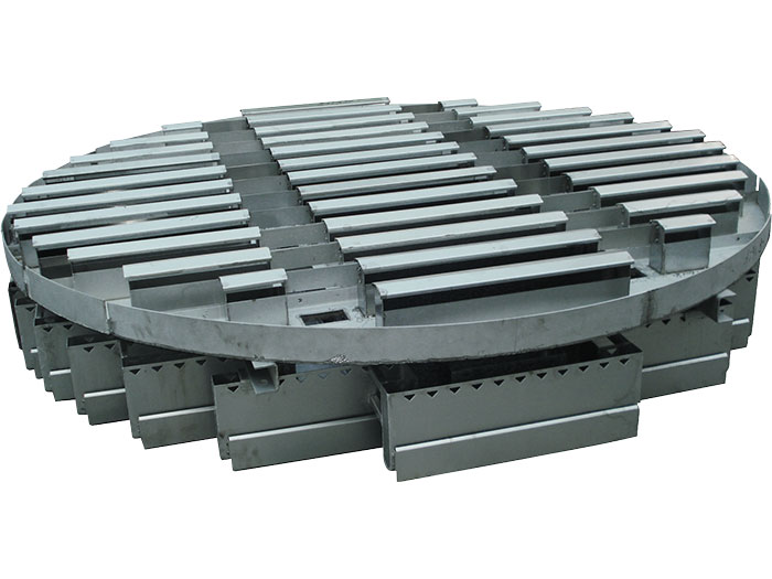 特点:窄槽式液体分布器采用了多级沉降措施,防止分布孔堵塞;塔内汽相分布干扰小。压降低;有良好的分布性能,其初始分布不均匀率<1%。液体进入第 一层填料即形成均匀的面分布,消除了“端效应”从而不必加高填料层来弥补损失的分离效率;操作负荷弹性大,无论在流量负荷上限或下限,都能均匀分布;良好的缓冲性能,流量的瞬间波动不会引起填料表面的变化,且有效地消除了自身的液位梯度;自身所占高度小,有利于旧塔改造。